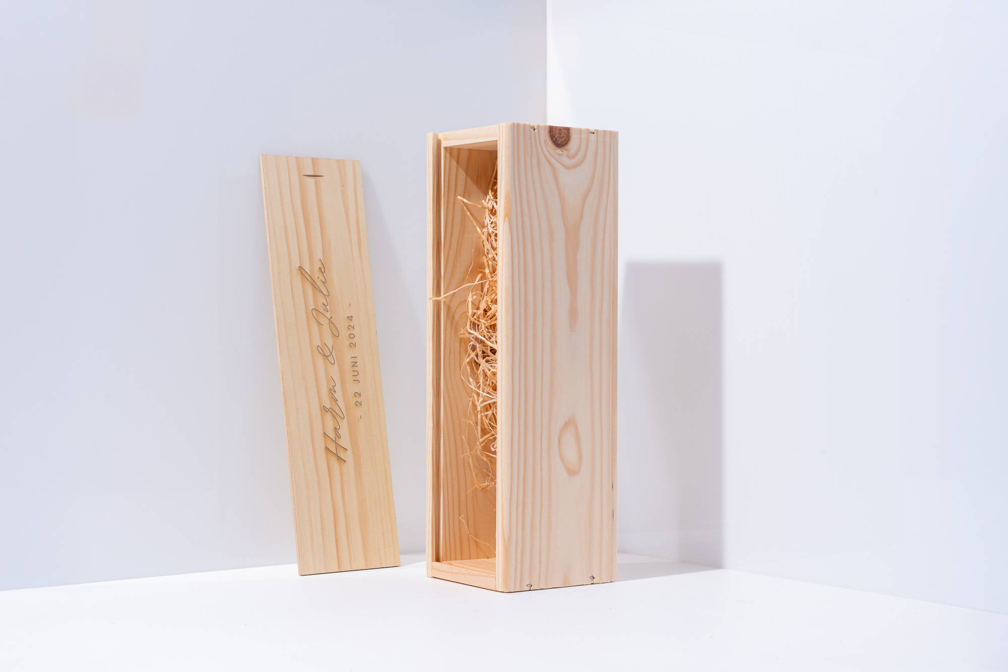 De houten wijnkist wordt met zorg voorzien van een persoonlijke gravering, kies een naam, datum of korte tekst om het cadeau helemaal uniek te maken. Omdat hout een natuurproduct is, kan de kleur en houtnerf per kist licht verschillen, wat elk exemplaar een eigen, natuurlijke charme geeft.